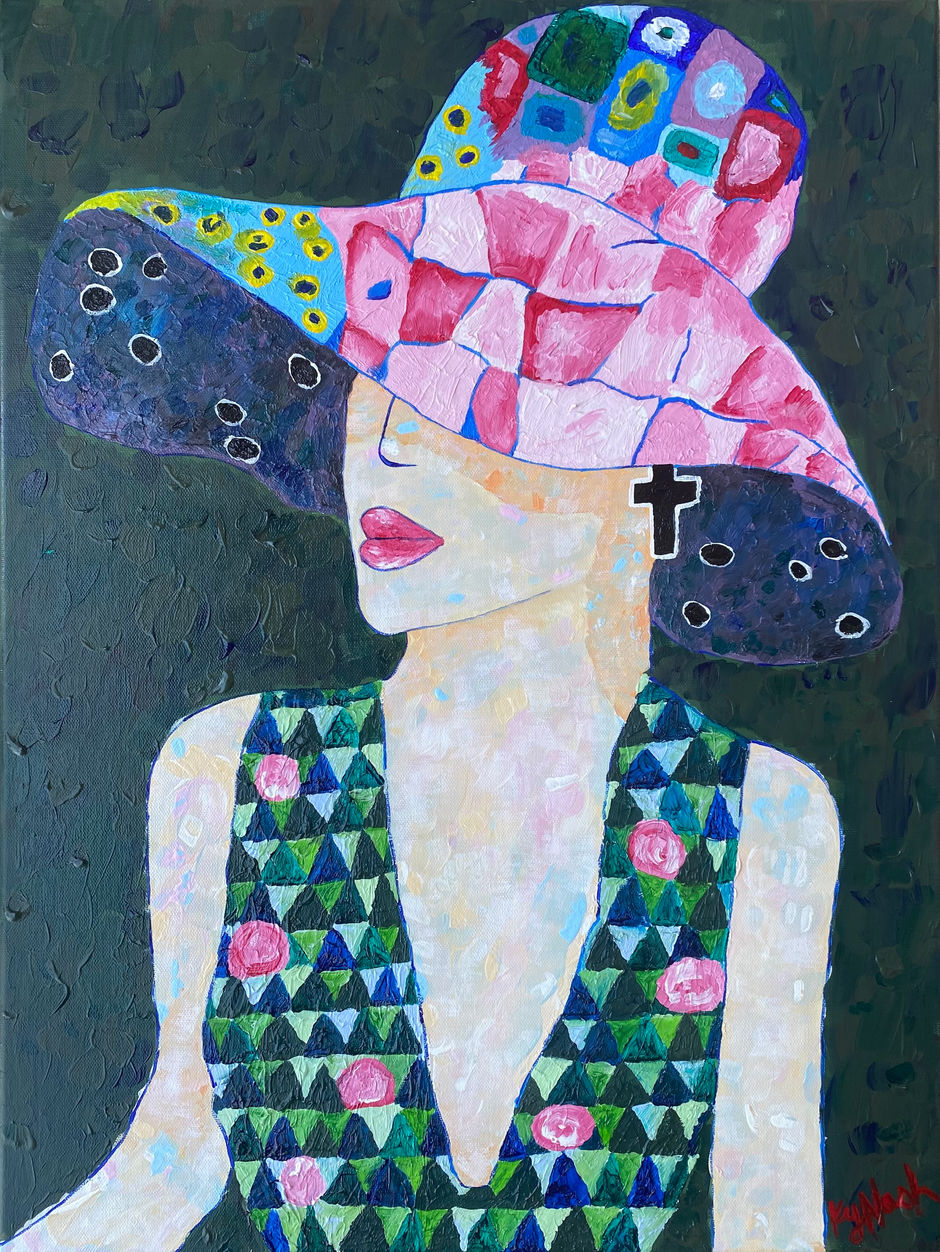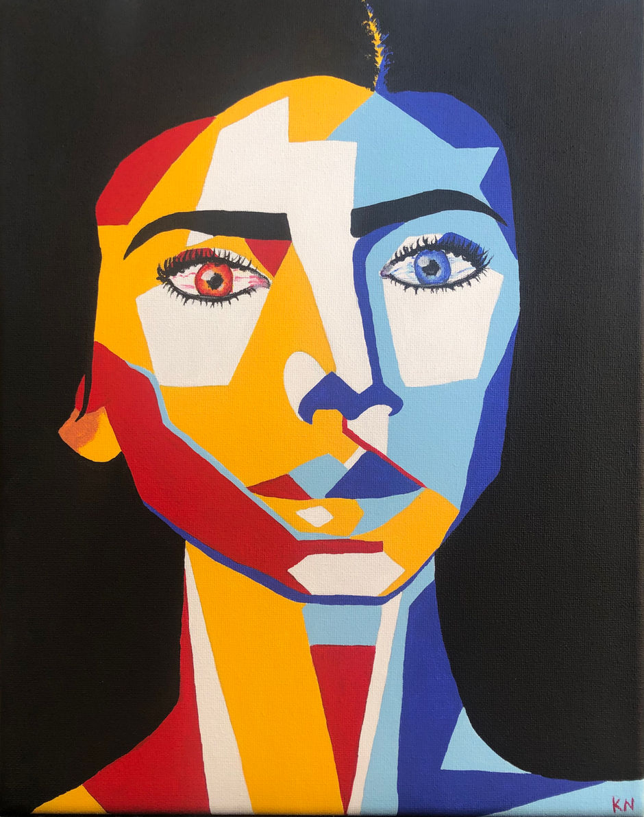 Struggling with identity has inspired me to paint portraits and human forms displaying different facial expressions. I paint with the thought in my head, “What is this person’s story?” I keep my paintings colorful with a tone of creepiness that is sometimes found in their eyes. Surrealism is found in most of my paintings by my aggressive brushstrokes next to a very controlled area of color. I think of my paintings as different people in an alternative, fantasy life that I often compare myself to. Gustav Klimt is an inspiration for me because of his colors, texture and effective use of brushstrokes. My other inspiration is the Art Deco Fashion Era from the 1920s.